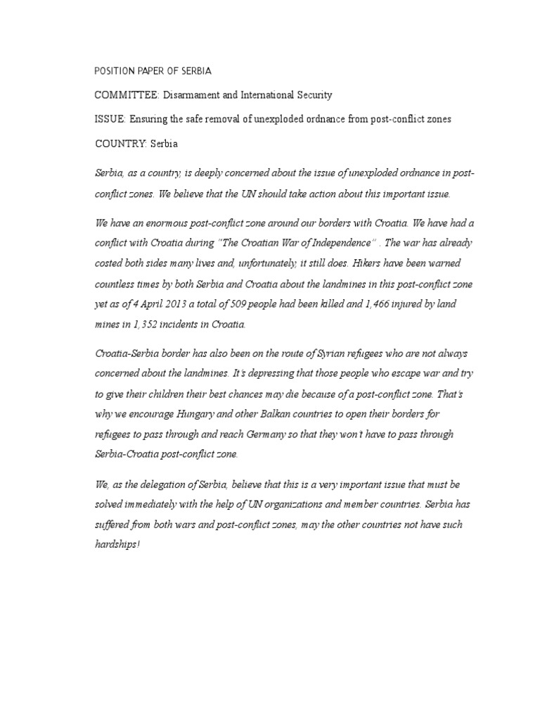You cannot be divided in opinion. As representatives of a country, the position paper must be written in the third person. It should also show how the topic is of interest to your country. The last 10 years have seen drastic changes in asia. Documents similar to sample position paper for mun.